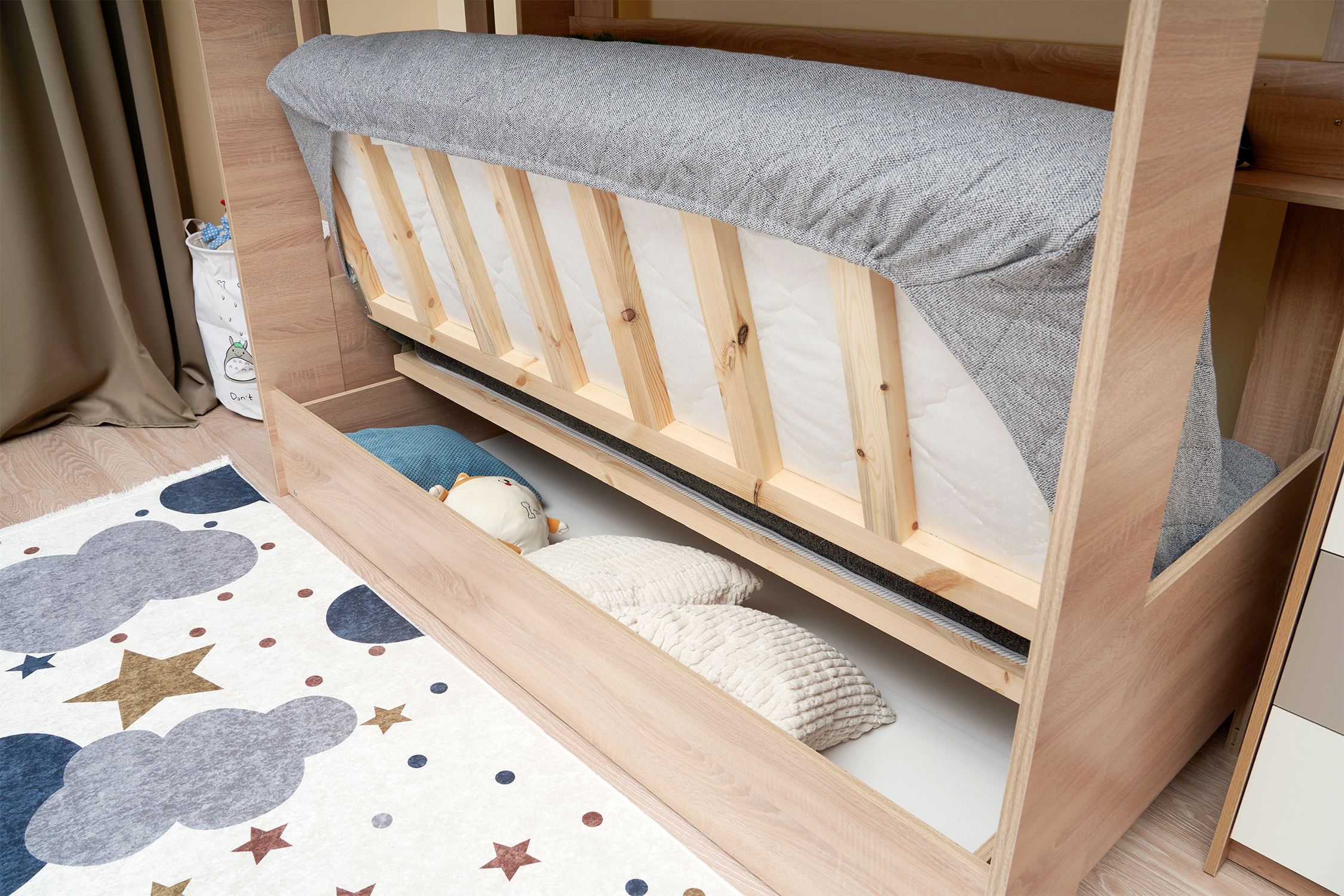 Механизм трансформации дивана: «Книжка». Рекомендуемая высота матраса на верхний ярус 17 см. Максимальная нагрузка на верхний ярус 50 кг. Лестница может быть установлена с обеих сторон кровати. Высота бортика 30 см. Максимальная нагрузка на нижний ярус 90 кг. Чехол съемный.