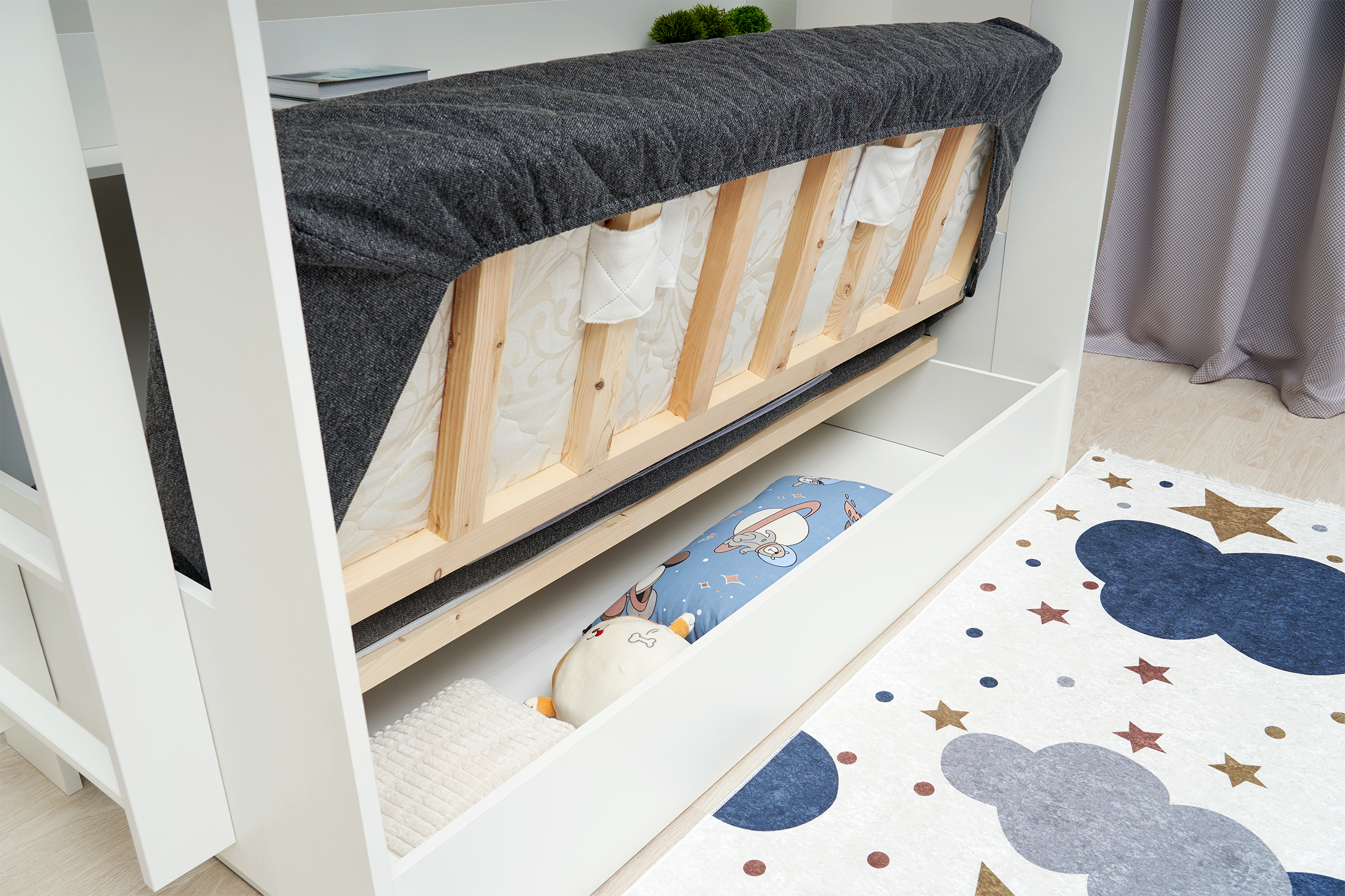 Механизм трансформации дивана: «Книжка». Рекомендуемая высота матраса на верхний ярус 17 см. Максимальная нагрузка на верхний ярус 50 кг. Лестница может быть установлена с обеих сторон кровати. Высота бортика 30 см. Максимальная нагрузка на нижний ярус 90 кг. Чехол съемный.