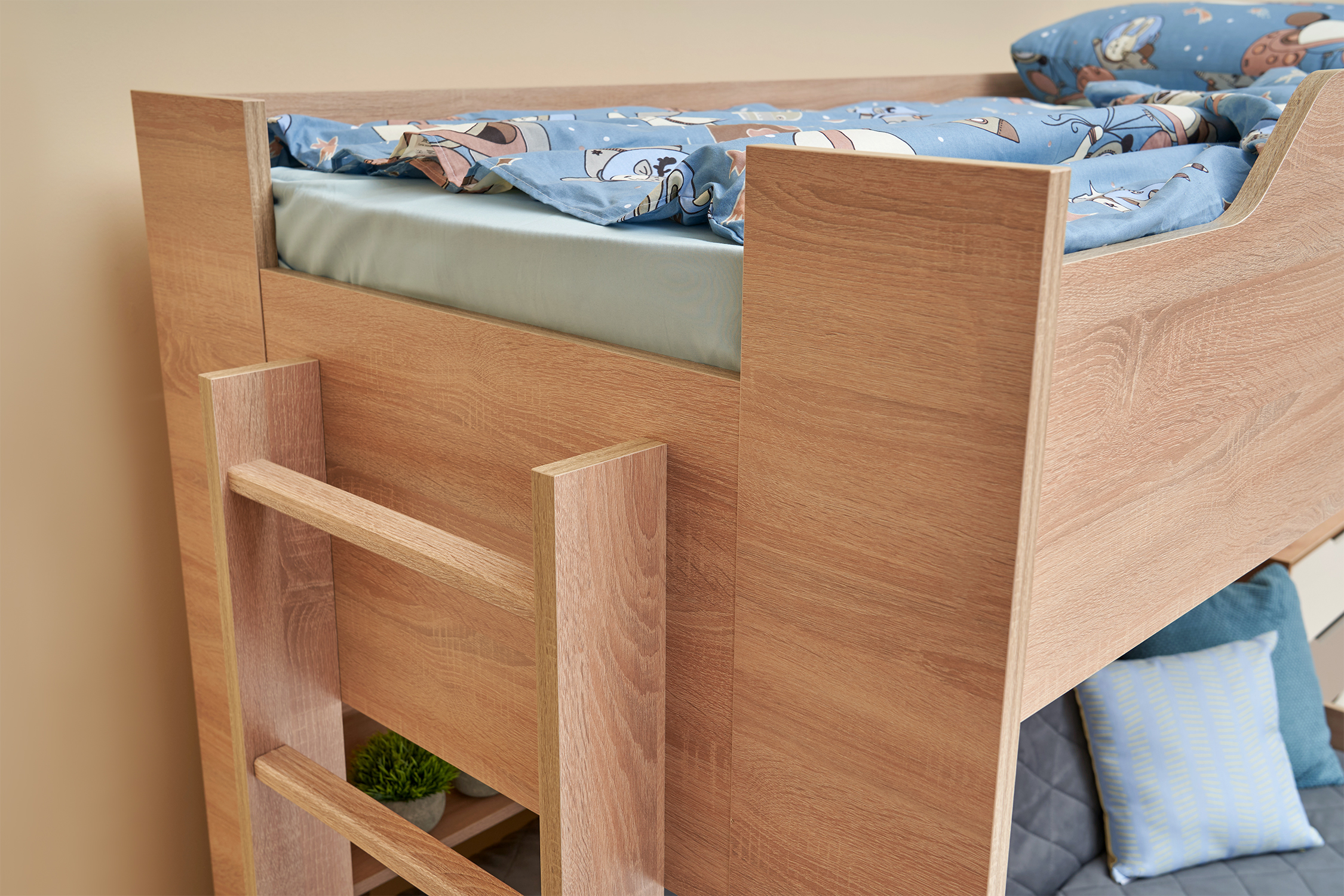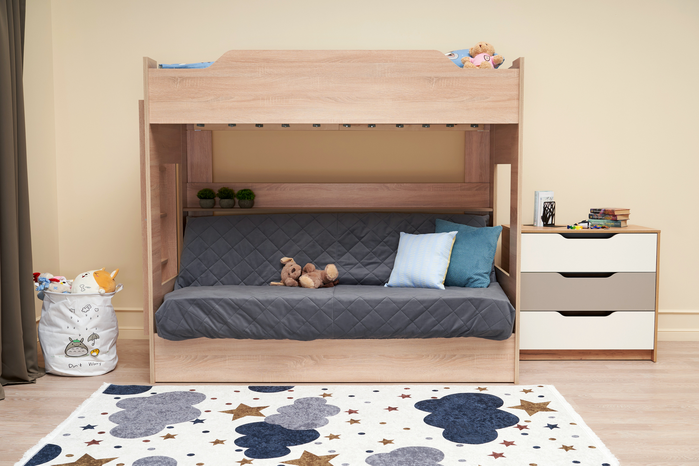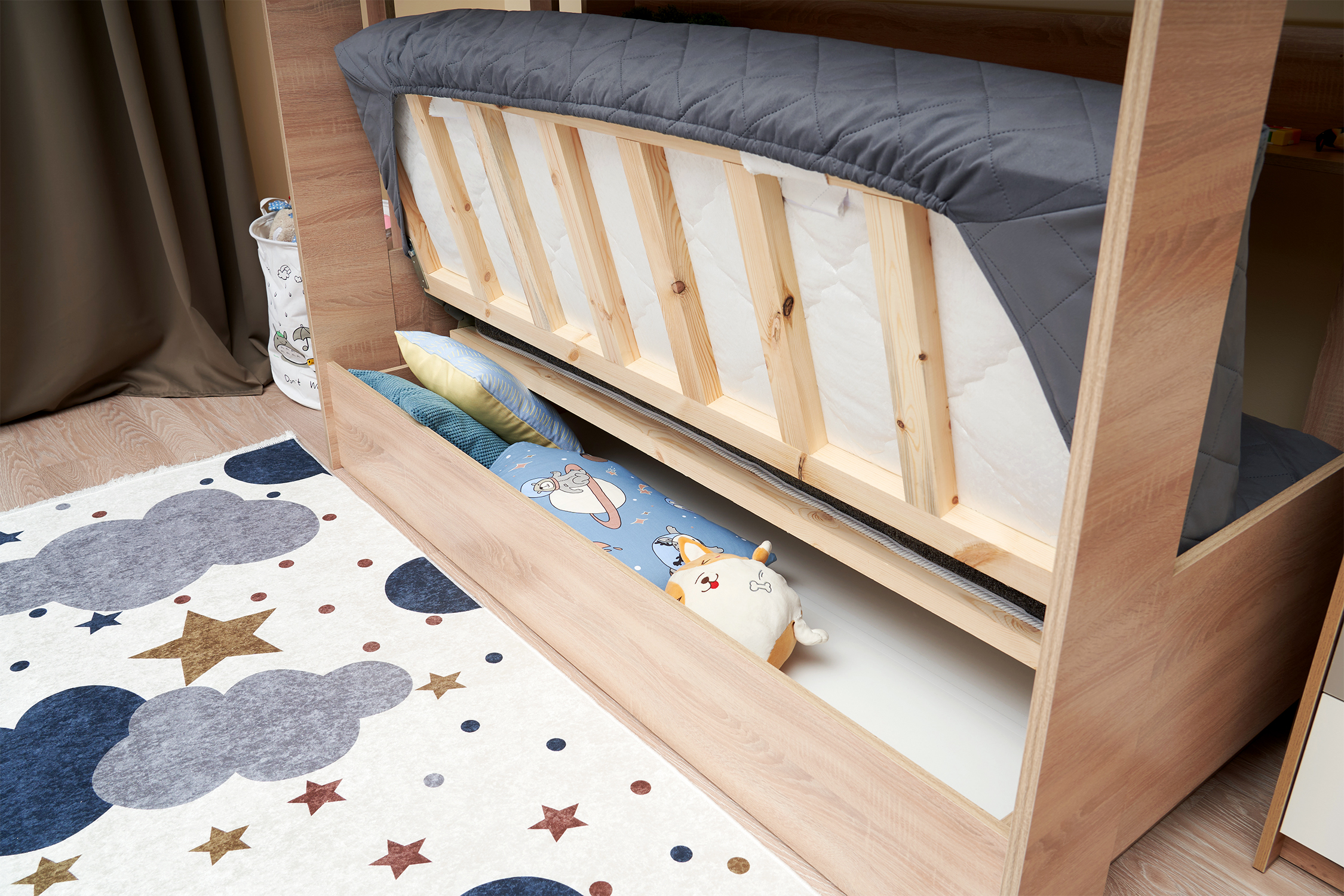 Механизм трансформации дивана: «Книжка». Рекомендуемая высота матраса на верхний ярус 17 см. Максимальная нагрузка на верхний ярус 50 кг. Лестница может быть установлена с обеих сторон кровати. Высота бортика 30 см. Максимальная нагрузка на нижний ярус 90 кг. Чехол съемный.