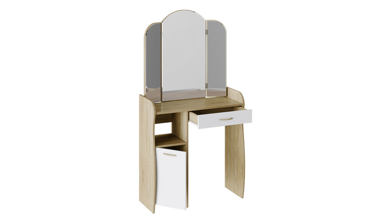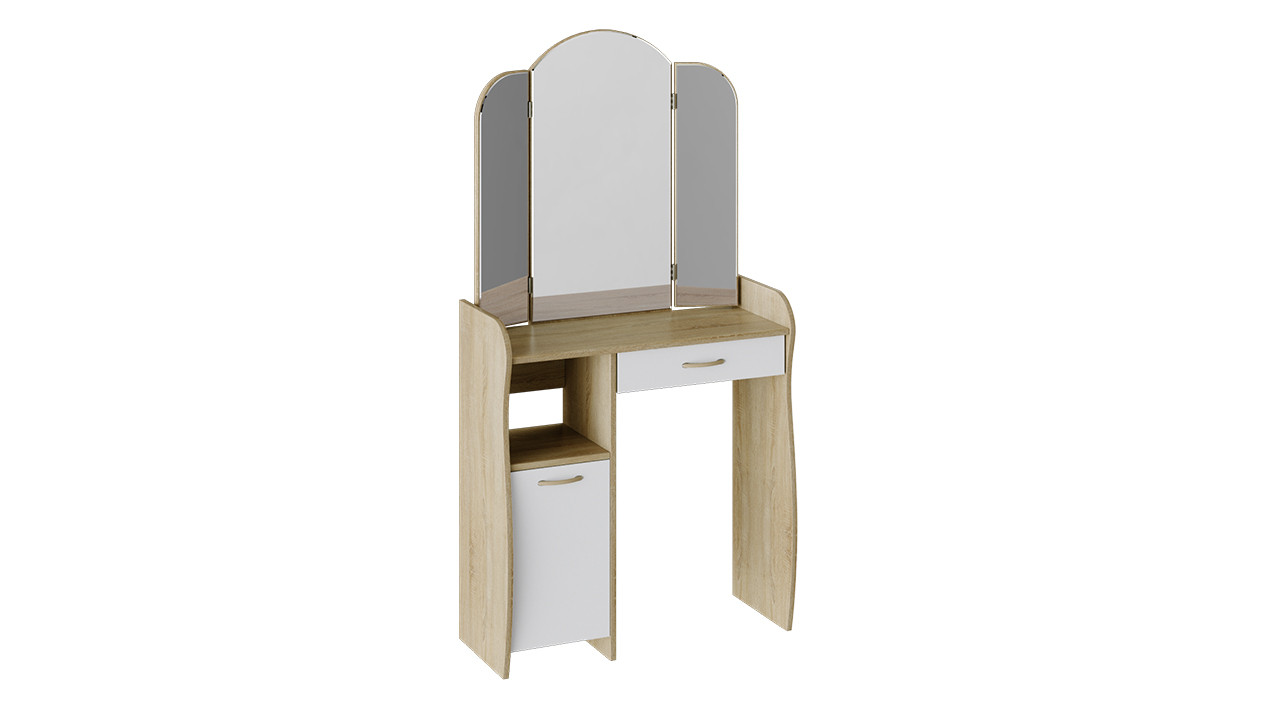 Лаконично простой и элегантный туалетный столик обладает не только эстетичным видом, но и достойной практичностью. Модель отличается эргономичной конструкцией и элегантной формой деталей. Вместительный ящик, столешница, большое зеркало и полки расположены на удобном уровне. Использование двух цветов в дизайне модели делает её оригинальной и позволяет использовать в любом интерьере.